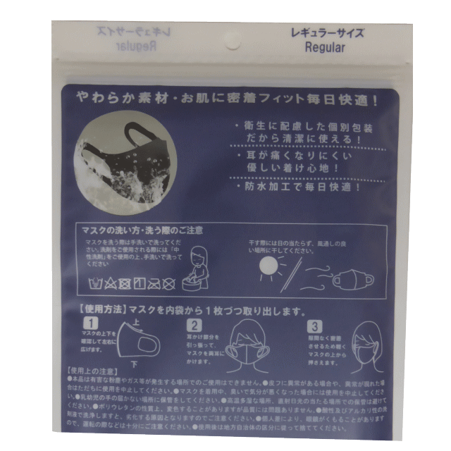 ●本品は有害な粉塵やガス等が発生する場所でのご使用はできません ●皮ふに異常がある場合や、異常が現れた場合はただちに仕様を中止してください ●マスクを着用中、においで気分が悪くなった場合には仕様を中止してください ●乳幼児の手の届かない場所に保管してください ●高温多湿な場所、直射日光の当たる場所での保管は避けてください ●酸性及びアルカリ性の洗剤液で洗浄しますと、劣化する原因となりますのでご注意ください ●個人差により、眼鏡がくもることがありますので、運転の際などには 十分にご注意ください ●使用後は地方自治体の区分に従って捨ててください ソフトフィットマスク SOFT FIT MASK ソフトフィットクールマスク SOFT FIT COOL MASK