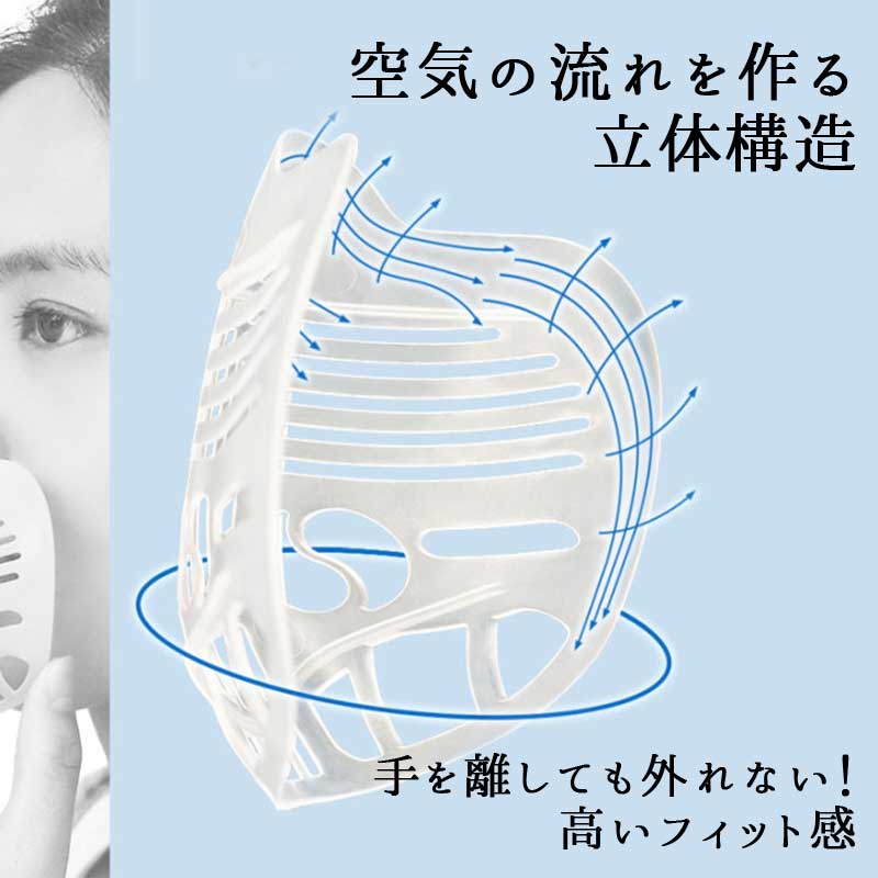 マスク着用時にお使い頂く事により、マスクとお顔の間に空間を作り、密着間が軽減されマスクによる息苦しさを改善してくれます。