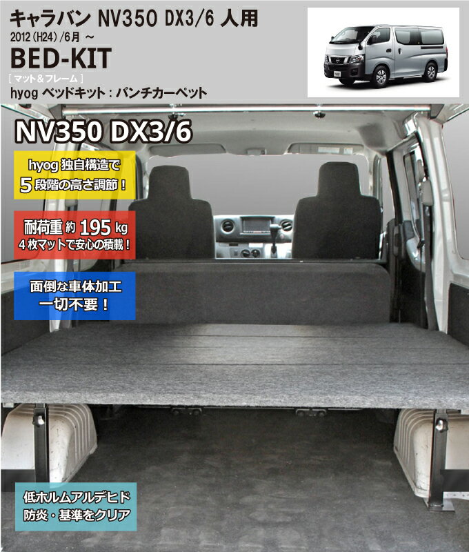 必ずお読みください メーカー hyog ヒョーグ(自社工場にて生産) 商品内容 ・5段階高さ調節機能 ベッドフレーム ×左右2本 ・4分割ベッドマット ・土台固定用ノブ付ボルト×8 ・高さ調節用ノブ付ボルト ×4 ・取り扱い説明書 1枚 【素材】 スチール・24mm合板(低ホルムアルデヒト) パンチカーペット(ダークグレー) 【カラー】ブラック 【重量】約40kg 【サイズ】:約1830mm 【適合車種】 NV350 キャラバン DX 標準ボディ 6人乗り※DX9人乗りは取付不可 【年式】 平成24年6月〜 納期 ■通常7営業日以内に発送いたします。