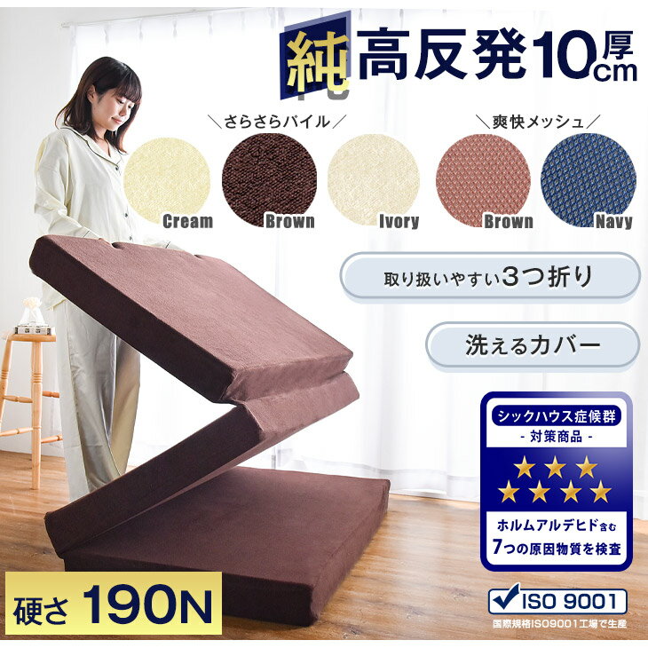 ▼ 三つ折りマットレスを動画で解説! ▼ ▼ サイズ違いはこちらです ▼ セミダブル ダブル クイーン キング ▼ 男性におすすめ!220N硬めの高反発 ▼ 消臭効果のある竹炭入り 仕様 サイズ 外寸:幅97x長さ195x厚み10cm 【スタッフみどぅのおすすめポイント!】 ・腰をやさしく支える高反発マットレス ・不純物を含まず、においを軽減させた純高反発 ・シックハウス症候群の原因物質7種をしっかり検査 ・厚みたっぷり10cmで、1枚でも底付き感のない寝心地 ・収納に便利な3つ折りタイプ ・ISO9001認可工場での生産 ・着脱しやすいU字ファスナー ・洗えるカバー4color ・パイル生地はエコテックス規格100認証 重量 [フラット]:約6.0kg(中材4.7kg) [プロファイル]【凸凹】:約5kg(中材3.7kg) 素材 側生地:シンカーパイル、メッシュ(ポリエステル100%) 中材:高反発ウレタンフォーム(密度25D <25kg/m3>、190N) カラー 【シンカーパイル】アイボリー、ブラウン、グレー、クリーム 【メッシュ】ブラウン、ネイビー 梱包サイズ 幅39×奥行39×高さ54cm 送料 【送料無料(沖縄県・離島は送料別途)】 ※沖縄県・離島の場合はお問い合わせください。